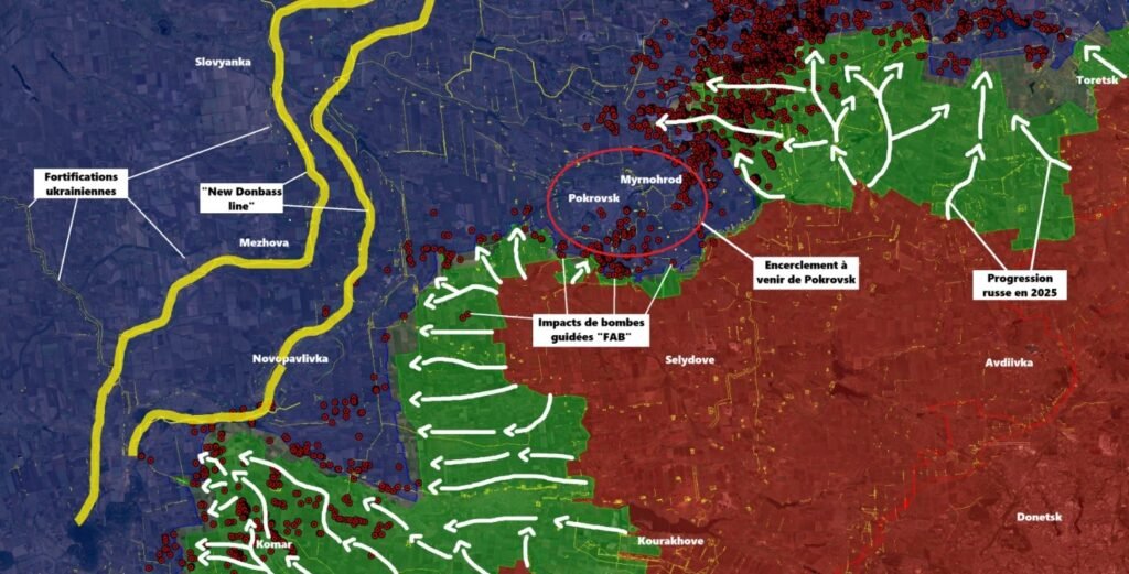 El Instituto para el Estudio de la Guerra (ISW por sus iniciales en inglés) describe ofensivas rusas persistentes con avances limitados y costos altos en vidas. Medios OSINT (inteligencia de fuentes abiertas) ucranianos como DeepState informan de una reciente ruptura de la línea defensiva cerca de Dobropillia y de avances que, si se consolidan, amenazan seriamente el oeste de Donetsk y el resto del Donbás. El bloguero militar Tatarigami afirma que no hay ruptura general de momento, pero la ciudad estratégica de Pokrovsk puede volverse insostenible si la brecha se ensancha.