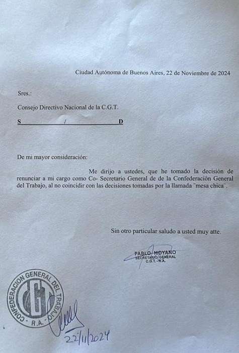 El dirigente camionero Pablo Moyano renunció a la co secretaría general de la Confederación General del Trabajo (CGT) por “no coincidir con las decisiones tomadas por la llamada ‘mesa chica’”, según explicó en una nota que dirigió al Consejo Directivo Nacional de la central obrera.
