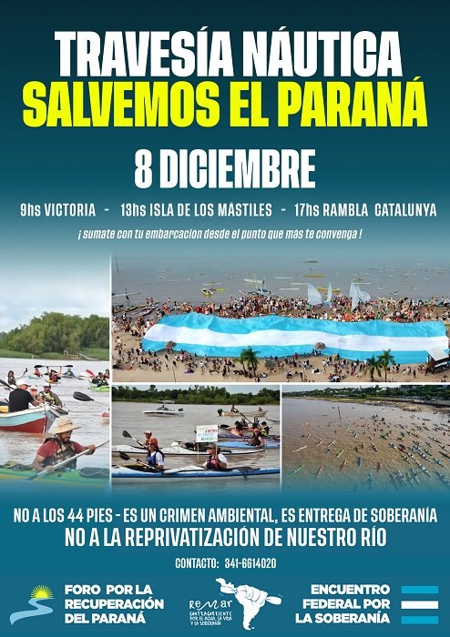 El manifiesto de la convocatoria advierte contra lo que califican como un “crimen ambiental” y una “entrega de soberanía”: se rechaza el proyecto de dragado a 44 pies del Río Paraná, así como su reprivatización y entrega a manos extranjeras.