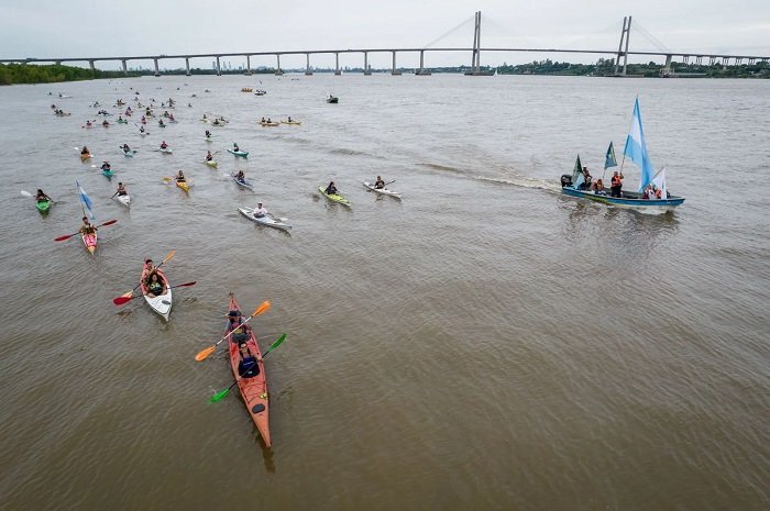 Hermanando las ciudades de Victoria y Rosario bajo la consigna “Salvemos el Paraná”, la reciente convocatoria fue impulsada por un amplio arco de organizaciones ambientales, sociales y políticas que en el mes de marzo del presente año fueron parte de la épica travesía “remar contra corriente por el agua, la vida y la soberanía” en una histórica remada por el Paraná, que unió los pueblos del litoral, a lo largo de más de 1.200 km.